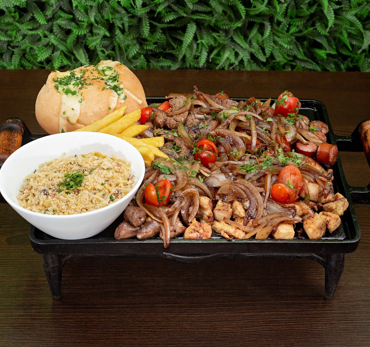 "Fome? Nossa chapa resolve! Carnes, fritas, farofa na medida certa para dividir. Vem aproveitar!"