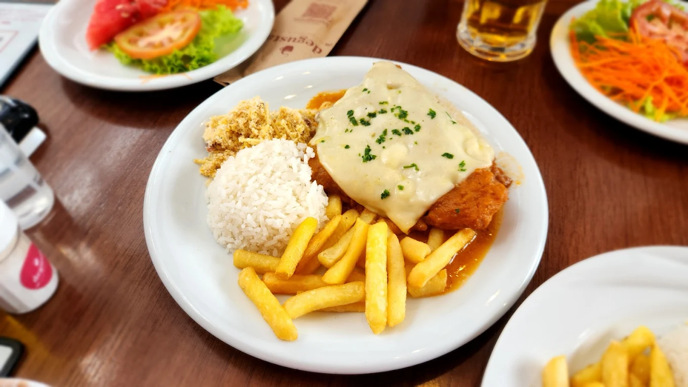 Filé à parmegiana suculento com queijo derretido, acompanhado de arroz soltinho, batata frita crocante e farofa. Aquele almoço perfeito que você merece!